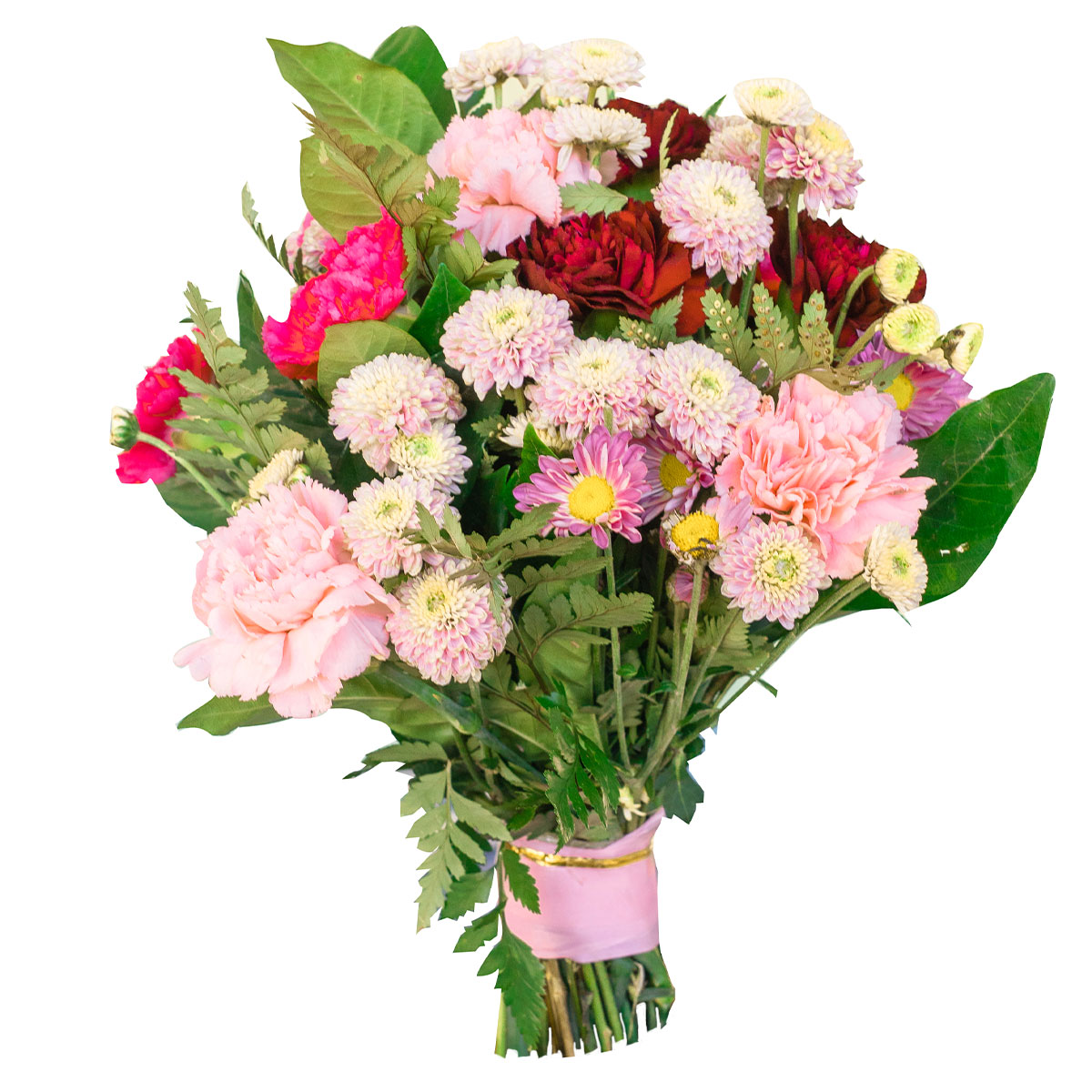 Гвоздика розовая, хризантема кустовая розовая, зелень. Упаковка (лента, пленка, крафт, сетка, пленка матовая)