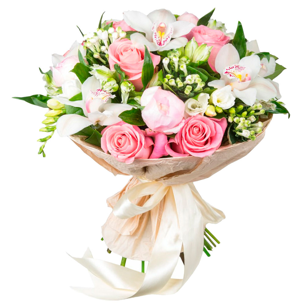Орхидея белая, роза одноголовая розовая, пион розовый, фрезия белая, зелень. Упаковка (лента, пленка, крафт, сетка, пленка матовая)