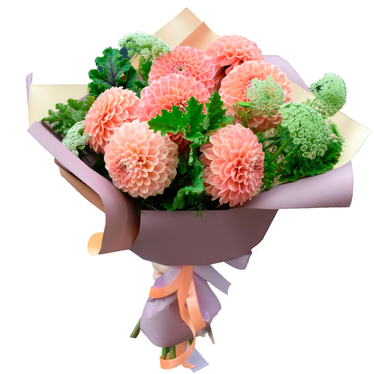 Георгина, зелень. Упаковка (лента, пленка, крафт, сетка, пленка матовая)