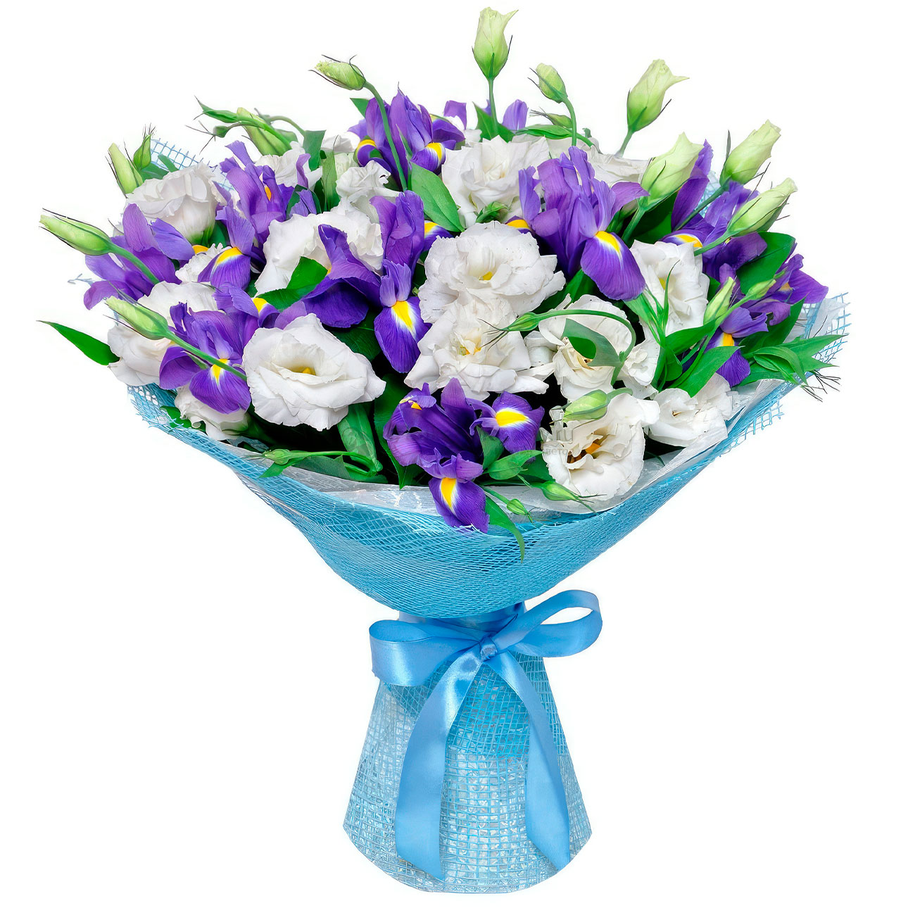 Лизиантус (эустома) белый, ирис фиолетовый, зелень. Упаковка (лента, пленка, крафт, сетка, пленка матовая)