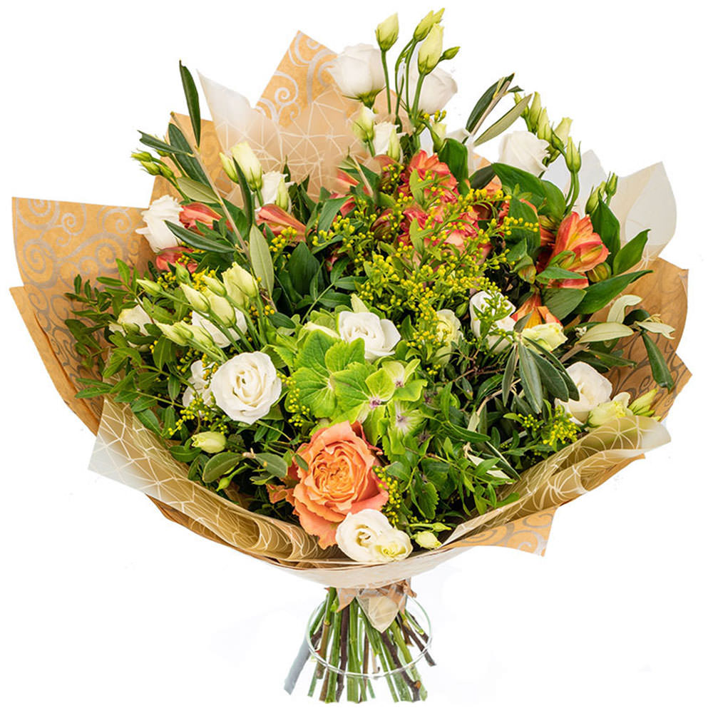 Роза пионовидная персиковая, эустома белая, альстромерия персиковая, фисташка, зелень. Упаковка (лента, пленка, крафт, сетка, пленка матовая)
