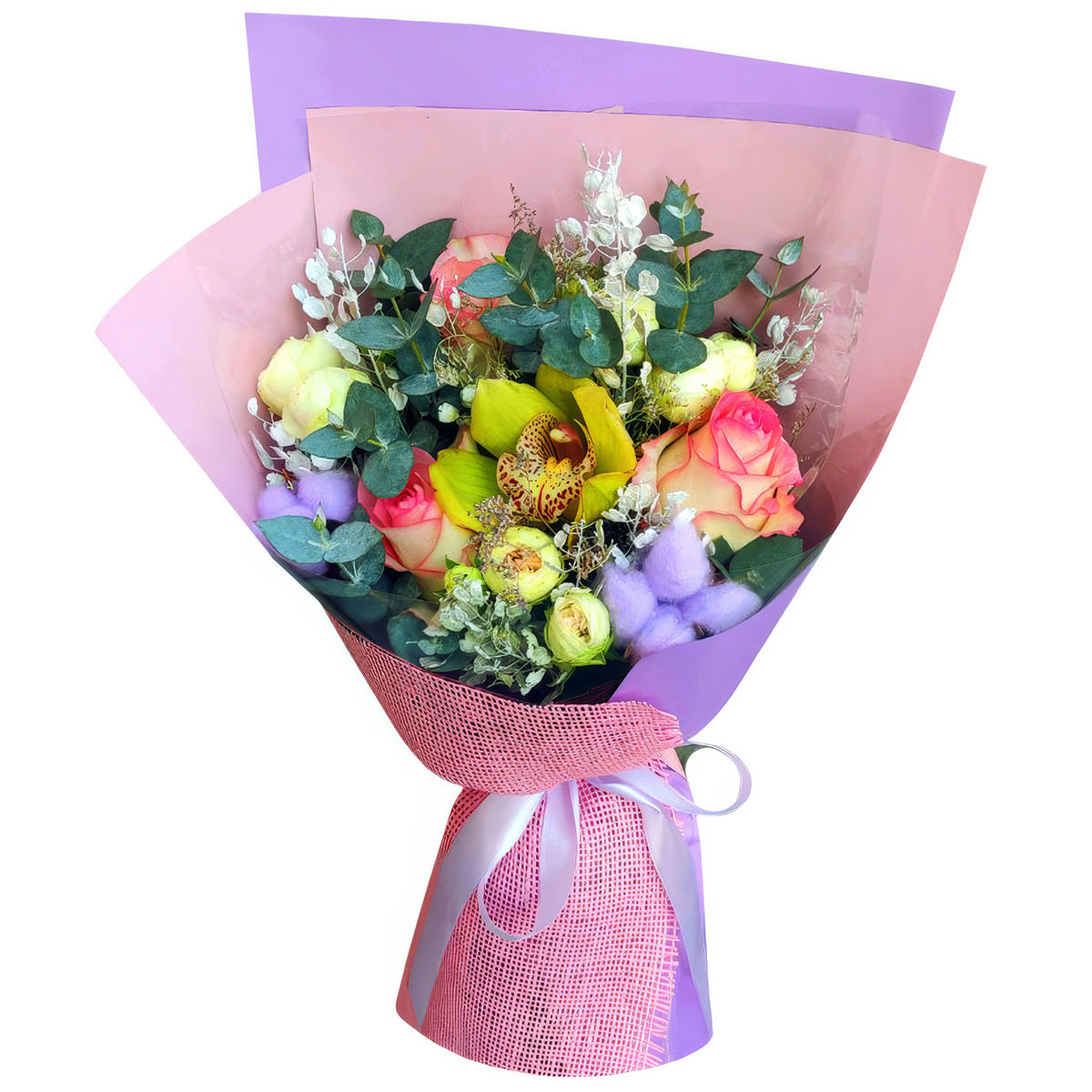 Орхидея желтая, роза одноголовая розовая, роза кустовая пионовидная, хлопок, эвкалипт, лунария. Упаковка (лента, пленка, крафт, сетка, пленка матовая)