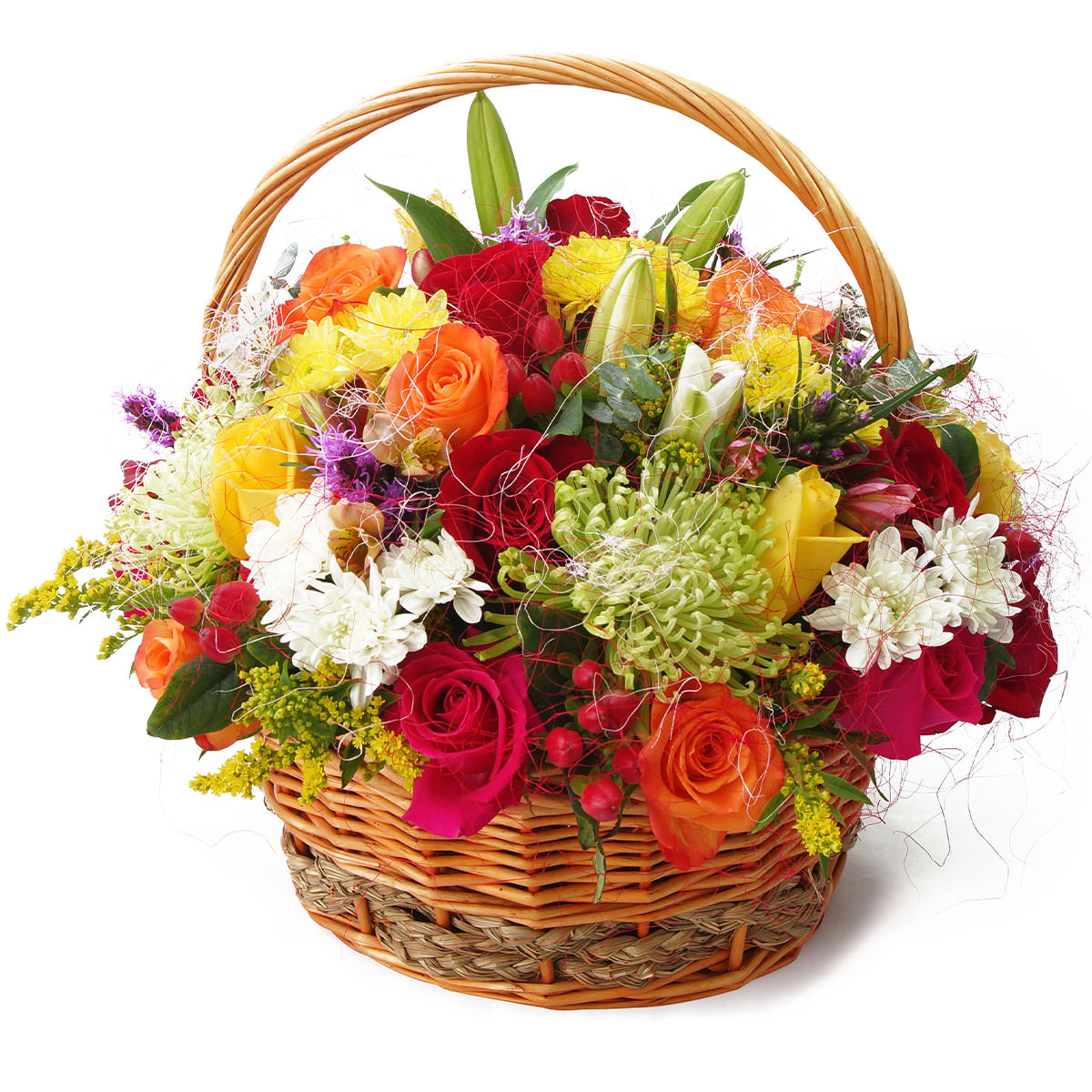 Роза одноголовая желтая, красная и оранжевая, хризантема кустовая белая и желтая, хризантема одноголовая зеленая, лилия белая, гиперикум, солидаго, эвкалипт. Упаковка (Корзина, оазис, ящик).