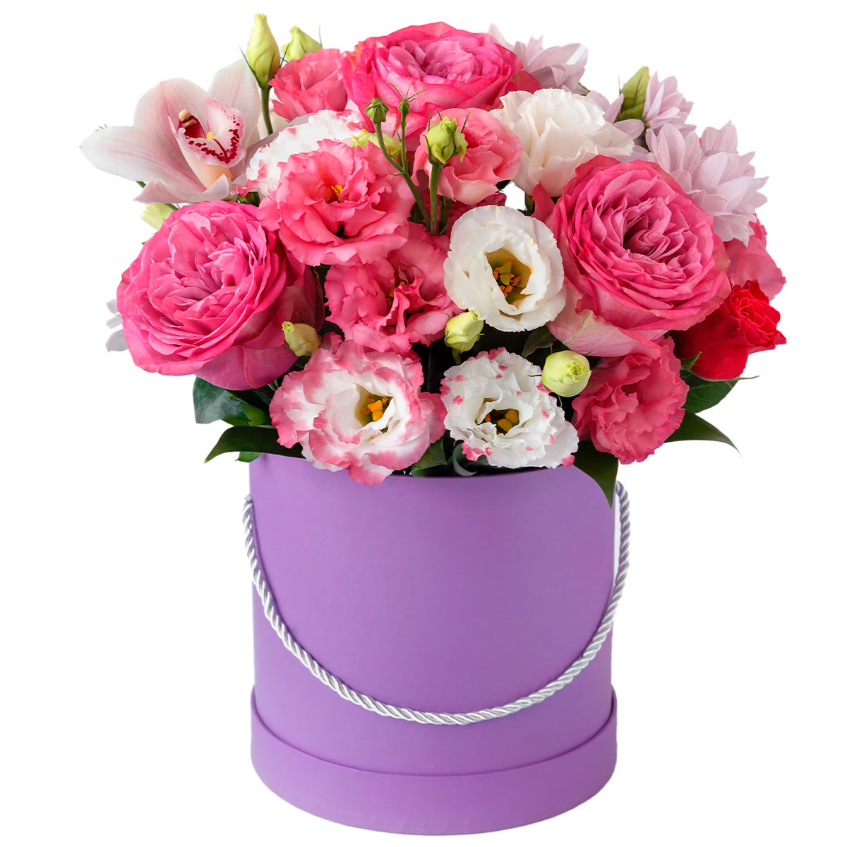 Роза пионовидная розовая, эустома белая и розовая, роза кустовая красная, орхидея розовая, хризантема кустовая нежно розовая. Упаковка (шляпная коробка, квадратный бокс, коробка сердце, оазис)