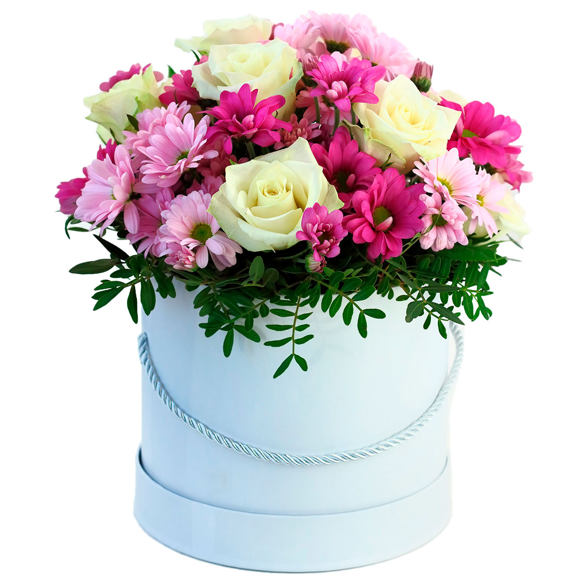 Роза одноголовая белая, хризантема кустовая розовая и сиреневая, зелень. Упаковка (шляпная коробка, квадратный бокс, коробка сердце, оазис)