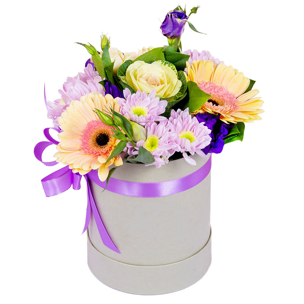 Гербера кремовая, хризантема кустовая сиреневая, брасика, эустома фиолетовая. Упаковка (шляпная коробка, квадратный бокс, коробка сердце, оазис)