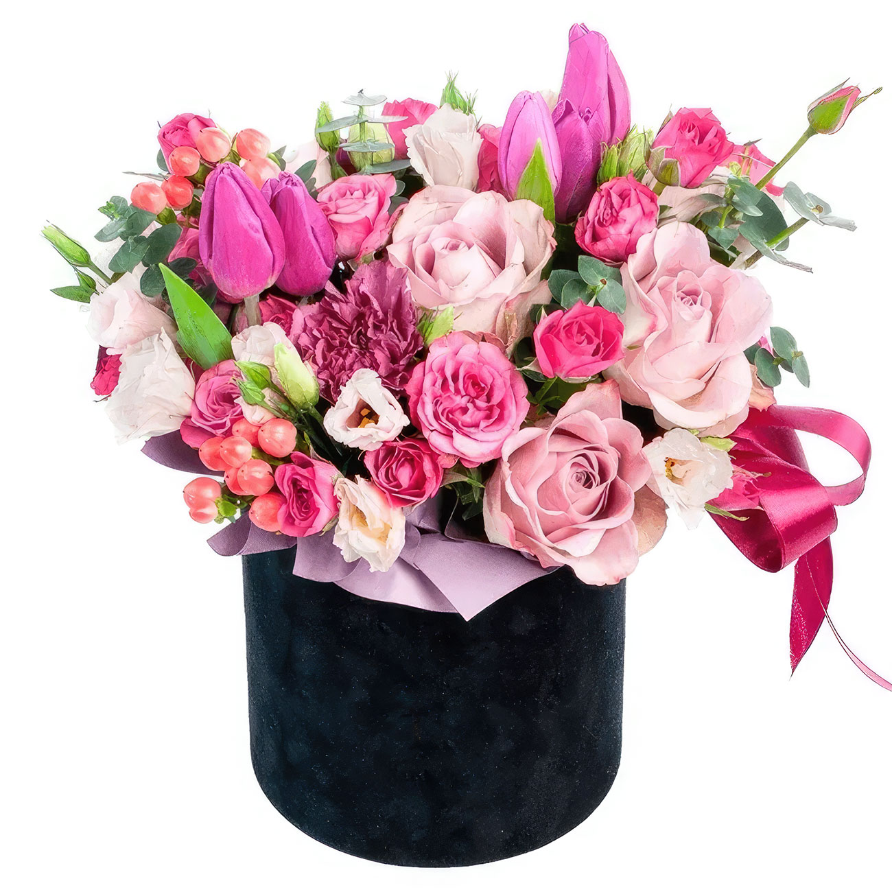 Роза одноголовая, тюльпан, кустовая роза, эустома, гиперикум. Упаковка (шляпная коробка, квадратный бокс, коробка сердце, оазис)