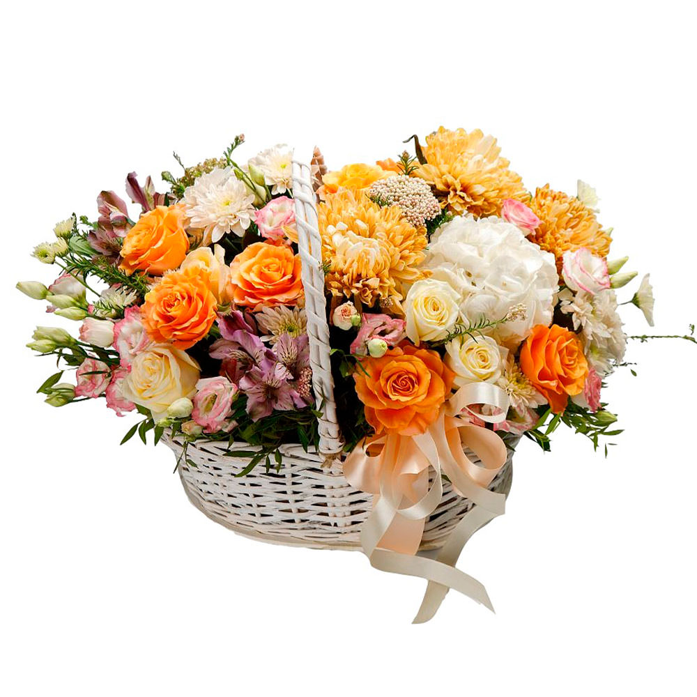 Роза одноголовая оранжевая и кремовая, хризантема белая, альстромерия розовая, эустома белая с розовым, озотамнус, гортензия белая. Упаковка (Корзина, оазис).